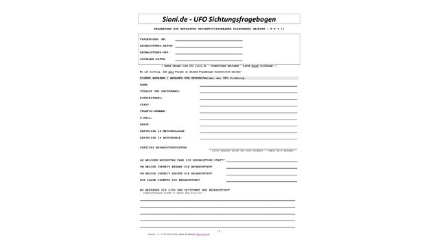 Frei Grenzwissenschaft Öffentlich v1.2Der UFO-Sichtungsfragebogen von Sioni.de. Haben Sie ein UFO/UAP gesehen? Laden Sie den Fragebogen runter, füllen ihn aus und senden ihn an uns.